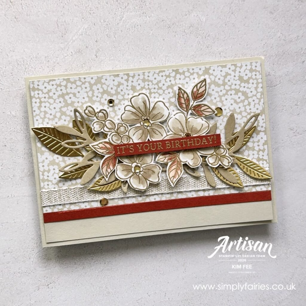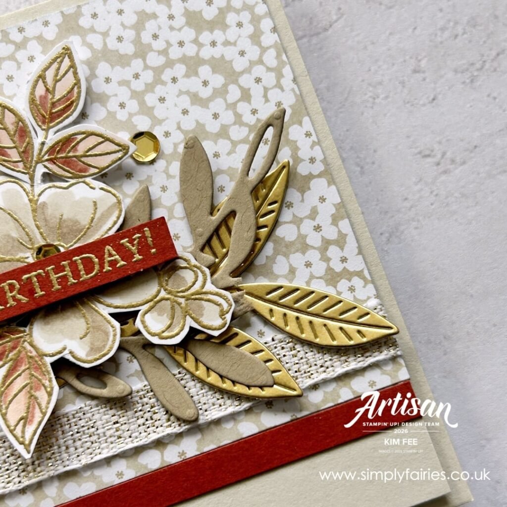 The focal point of the card is a floral image from Fragrant Layers Stamp set the new Online Exclusive section in my online Stampin” Up! store, You can see the stamp set HERE , I coloured using Stampin Blends and layered this onto Die cuts foliage from the Nature Symphony Dies set in my online SU shop HERE