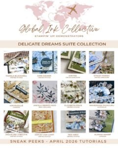 You will receive an exclusive tutorial bundle from the Global Ink Collective Design Team for April 2026. We are focussing on the beautiful Delicatee wishes Suite in my online Stampin Up Shop. There are 12 projects this month in written and video tutorial form The PDF Tutorial will have links to the step by step VIDEO for you to craft along with at your own leisure and create wonderful projects. Want to know how to get them for FREE by shopping? Continue reading below for more details.